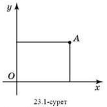 көрсететін Жазықтықтағы тікбұрышты координаталар жүйесі деп ортақ координаталар басы болатын өзара перпендикуляр координаталық түзулердің жұбын айтады. Координаталар басы О әрпімен, ал координаталық түзулер Ох, Оу арқылы белгіленеді және олар сәйкесінше абсцисса осі, ордината осі деп аталады (23.1-сурет).