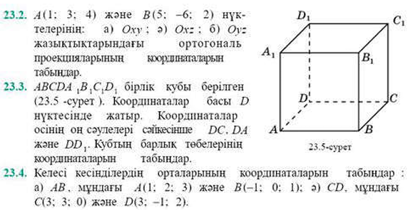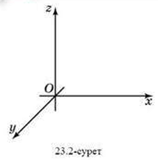 Координаталық түзудегі әрбір нүктеге осы нүктенің координатасы деп аталатын сан сәйкес келеді, ал жазықтықтағы координаталар жүйесіндегі әрбір нүктеге осы нүктенің координаталары деп аталатын (x, y) сандар жұбы сәйкес келеді. Тікбұрышты координаталарды алғашқы рет Р.Декарт енгізген, сондықтан тікбұрышты координаталар жүйесін – декарттық координаталар жүйесі, ал координаталарды декарттық координаталар деп атайды. Кеңістіктегі тікбұрышты координаталар жүйесі деп ортақ координаталар басы болатын өзара перпендикуляр координаталық түзулердің үштігін айтады. Координаталар басы О әрпімен, ал координаталық түзулер Ох, Оу, Оz арқылы белгіленеді және олар сәйкесінше абсцисса осі, ордината осі, аппликата осі деп аталады (23.2-сурет).