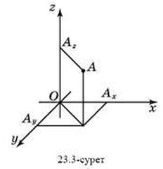Координаталық түзулер жұбы арқылы өтетін жазықтықтар координаталық жазықтықтар деп аталады және Оху, Охz, Oyz деп белгіленеді. Кеңістіктегі тікбұрышты координаталар жүйесінде кез келген А нүктесін қарастырайық. Осы нүкте арқылы Ох осіне перпендикуляр түзу жүргіземіз және Ох осімен қиылысу нүктесін Ах арқылы белгілейміз (23.3-сурет). Осы нүктенің Ох осіндегі координатасы А нүктесінің абсциссасы деп аталады және х арқылы белгіленеді. Осыған ұқсас Оу, Оz осьтерінде Ау және Az нүктелері анықталады, олар сәйкесінше А нүктесінің ординатасы мен аппликатасы деп аталады және сәйкесінше у пен z арқылы белгіленеді. (x; y; z) сандарының үштігі кеңістіктегі А нүктесінің координаталары деп аталады.