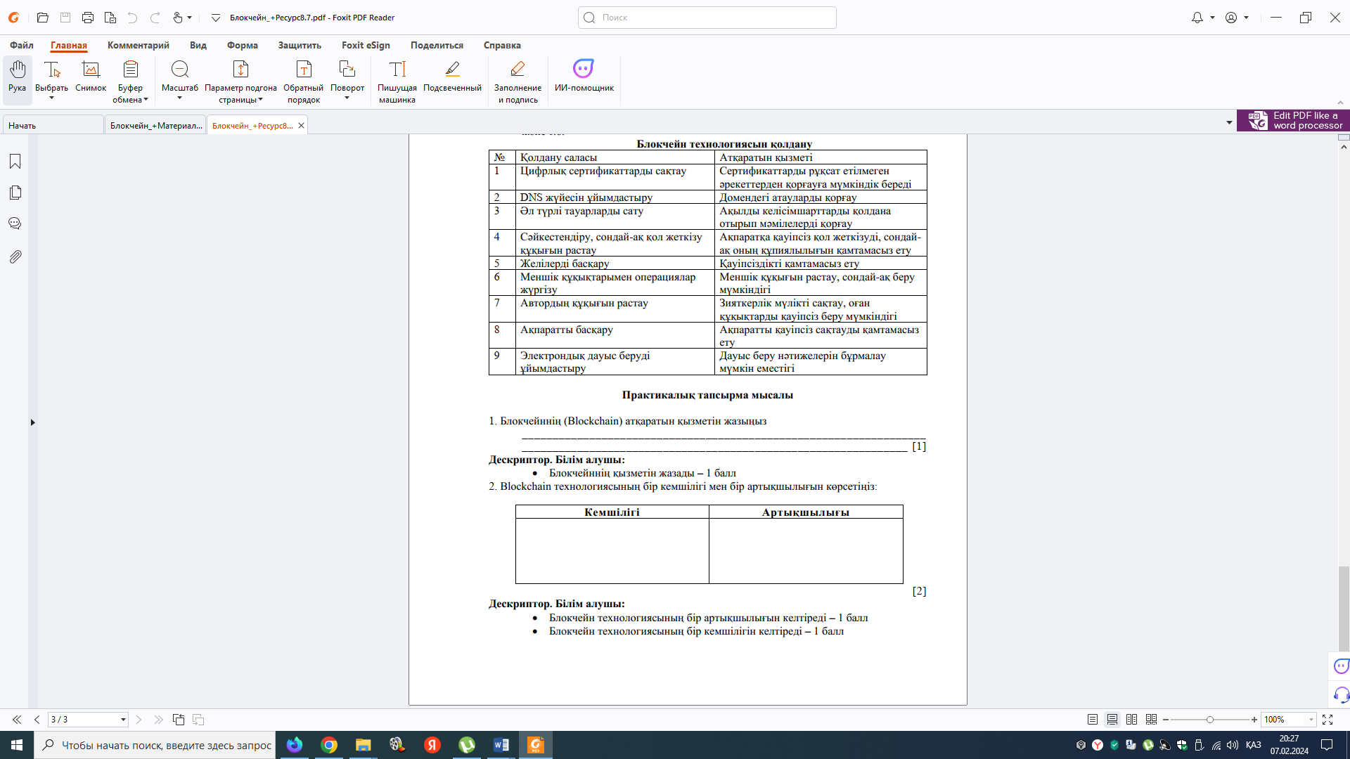 Дәптерге жазады Дескриптор: 1.Терминге анықтама береді 2. Blockchain технологиясының негізгі қызметін атайды |