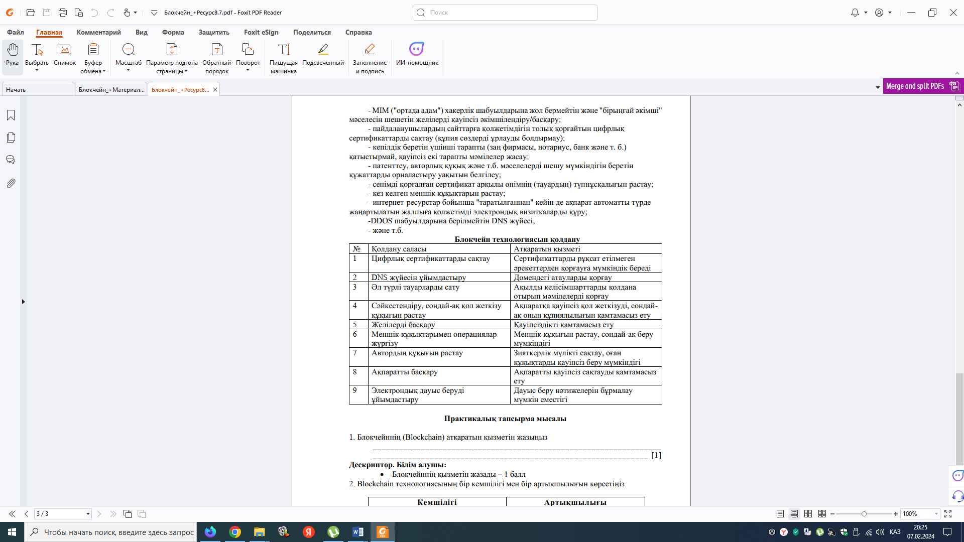 Blockchain технологиясы туралы бейнематериалды көру: https://www.youtube.com/watch?v=ttEkY4Owd1c Blockchain технологиясының маңызы қандай? Әр қатысушы бейнематериалдан көрген бір факіт туралы айтады және басқа адам оны қайталамауы керек.