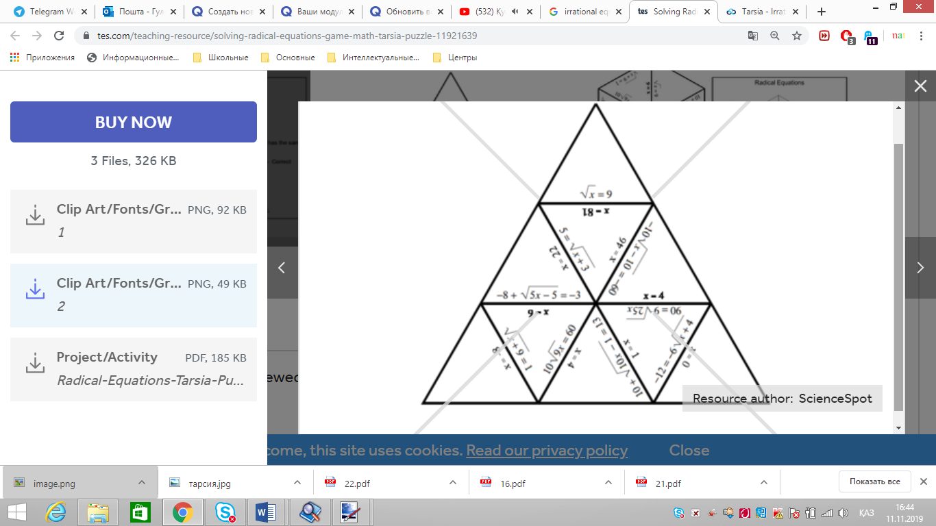 Білім алушыларды топқа бөлу. Саралау тәсілі. Топтастыру. Белсенді оқу әдісі: «Мозаика» әдісі бойынша топқа бөлемін. Білім алушылар 3 топқа топтастырылатынына байланысты Нұр-Сұлтан қаласының көрнекі жерлерінің суретінен құралған мозайка білім алушыларға таратылады. Мозайканы құрастыру арқылы топқа бөлінеді. Мысалы, Бәйтерек, Ханшатыр, Бейбітшілік және келісім Сарайы. Құрастырылған көрнекі жерлер бойынша қысқаша түрде мағлұмат береді. ІІ. Үй тапсырмасын тексеру. Үй жұмысында қиындық тудырған есептер болған жағдайда талқылау жүргізу. Белсенді оқу әдісі: «Блиц-турнир» әдісі. Алдыңғы алған білімдері бойынша қайталау сұрақтары қойылады.: 1. Иррационал өрнектер дегеніміз не? 2. Иррационал өрнектерді түрлендіру әдістерін ата 3. Бөлшек дәрежені түбірмен алмастыру қалай орындалады? 4. Иррационалдықтан арылу ережесін тұжырымда. 5. Иррационал өрнектерді түрлендіру барысында қысқаша көбейту формулалары қолданыла ма? 6. Көбейтіндіден түбір шығару қалай орындалады? 7. n-ші дәрежелі түбір мәнінің саны неге байланысты? 8. Дәрежені дәрежелеу ережесін тұжырымда. 9. Неге теріс санның жұп дәрежелі түбірі болмайды? 10.Жұп дәрежелі түбір айырмашылығының мәні неде? |