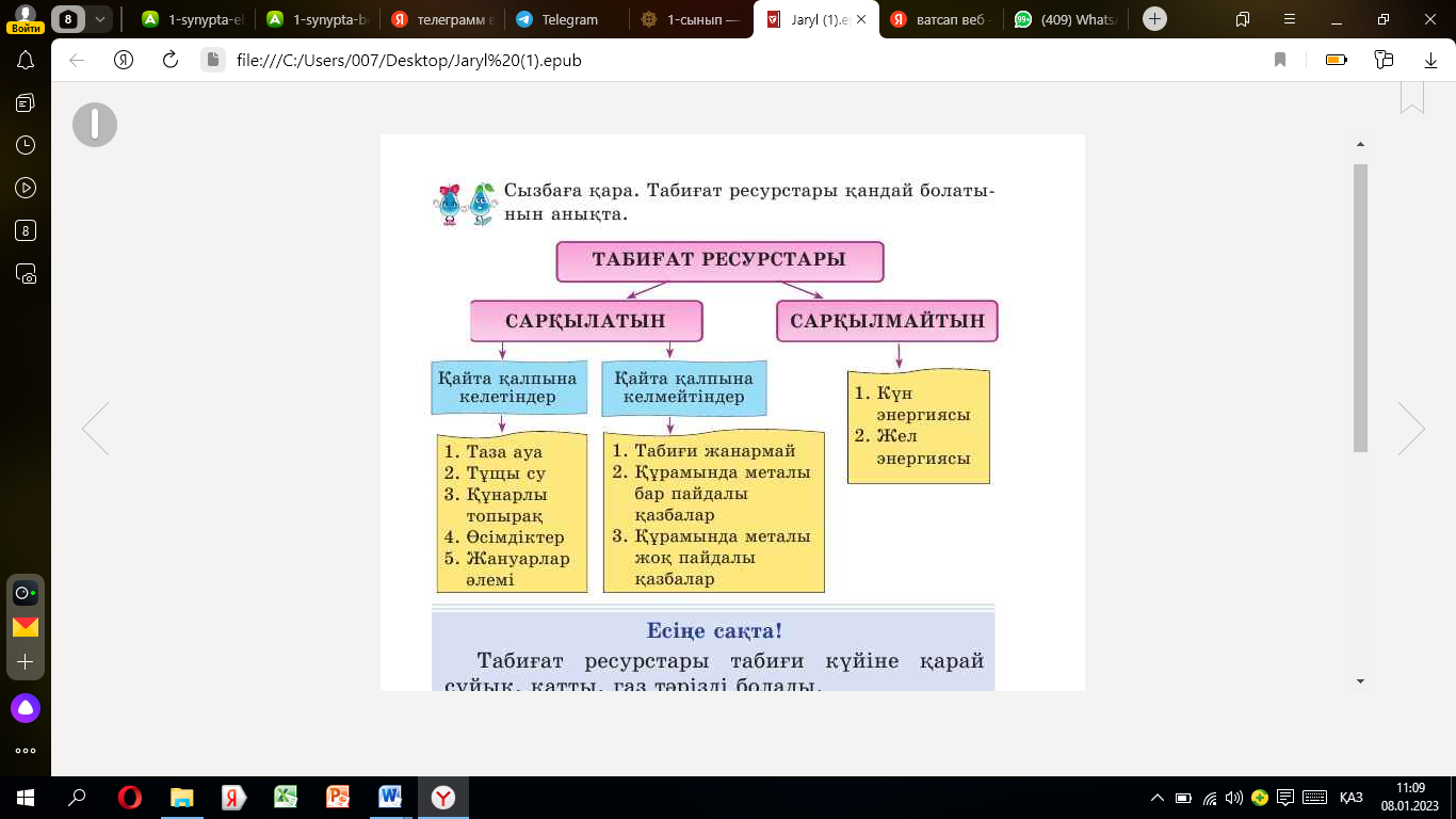 2-тапсырм Жұптық жұмыс «Анықта» әдісі Сызбаға қара. Табиғат ресурстары қандай болатынын анықта. ЕББҚ Тапсырманы орындауда қолдау көрсету Талқылау сұрақтары: 1. Табиғат ресурстарын шығу тегі бойынша неше топқа бөлінеді? |