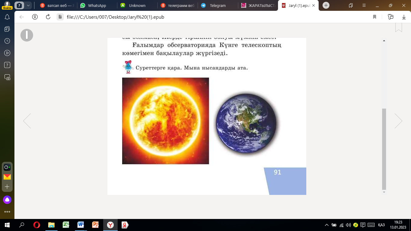 Үй тапсырмасын тексеру Қосымша ақпарат көздерінен сұйық күйдегі табиғат ресурстары туралы мәлімет ідеп тап. «Серпілген сауал» Ғаламшар деген не? Ғарыштық нысандар қандай пішінге ие? Сабақтың тақырыбы мен мақсатын хабарлау Жер мен күннің арасындағы байланысты білесің 1- тапсырма Ұжымдық жұмыс «Кесте» әдісі Суретке қарап сұрақтарға жауап жаз. Суреттегі ғарыштық нысандар жайлы не білесің? ЕББҚ Тапсырманы орындауда қолдау көрсету Талқылау сұрақтары: 1. Ғалымдар күнді қалай бақылайды? |