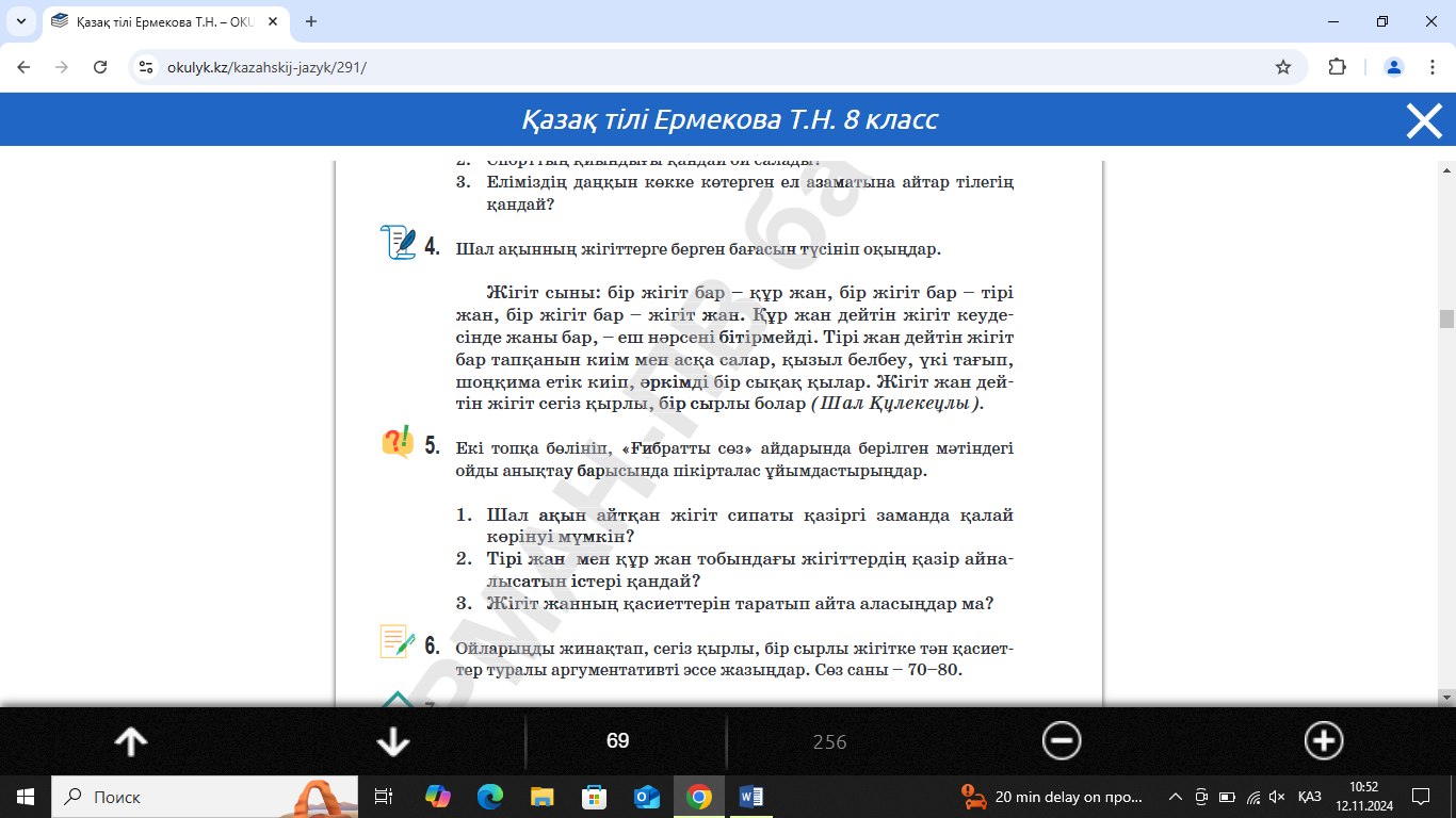 №3 тапсырма Шал ақынның жігіттерге берген бағасын түсініп оқыңдар. «Ғибратты сөз» айдарында берілген мәтіндегі ойды анықтау барысында пікірталас ұйымдастырыңдар.