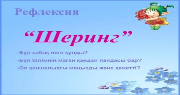 1 Сәлемдесу, оқушыларды түгелдеу. 2.Психалогиялық ахуалл. «Гүлмен тілек» Оқушылар арнайы дайындалып келген гүлді алақандарына салып тұрып, бір-біріне тілек тілейді және гүлдің астына жазылған сөздер бойынша топқа біріктіріледі. Өткен сабақты пысықтау «3 таяқша» әдісі Үй тапсырмасына байланысты 1 сұрақ 1 жауап 1 идея әр топ даярлап, көпшілікке салады |