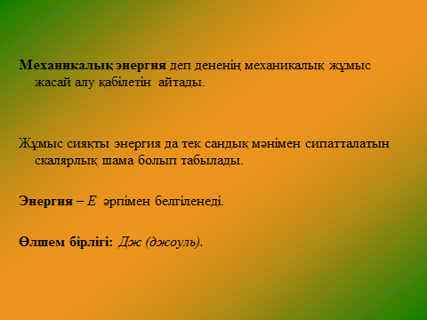 Барлық оқушылар істей алады: Механикалық энергияның екі түрін ажырата білу, формуланы жазу. Көптеген оқушылар істей алады: Есептер шығаруда қолдану. Кейбір оқушылар істей алады: Тәжірибелік күрделі есептер шығару. |