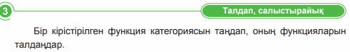 Презентация Кірістірілген функциялар мәтіндік және логикалық функциялар.pptx Оқулық , А-4 парақшасы, маркер, стикер Жұмыс дәптер Компьютер Таратпа қағаз https://wordwall.net/th/resource/64931967 |
