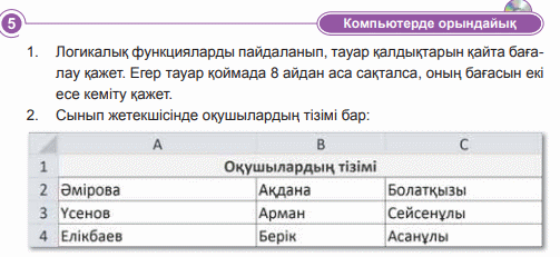 Дескриптор: Логикалық функциялар, мәтіндік функциялар, сілтеме және массив функцияларының маңыздылығын түсіндіреді 2балл Дескриптор: - Бір кірістірілген функция категориясын таңдап, оның функцияларын талдайды 2 балл Дескриптор: -Логикалық функцияларды пайдаланып компьютерде жұмыс жасайды -2 балл Дескриптор: Сұраққа жауап береді Дескриптор: Онлайн платформа арқылы сұрақтарға жауап береді 2 балл |