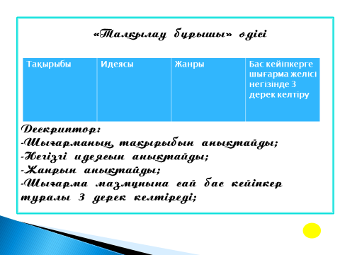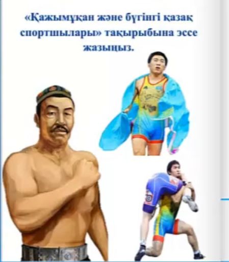 Дескриптор: - Берілген сұрақтарға повесттің сюжеттік желісі бойынша дұрыс жауап береді; - Берілген ұйқас бойынша өлең құрастырады; - Өзін басты кейіпкермен өзара салыстырады; Бекіту тапсырмасы: «Блиц сұрақтар» әдісі. 1. Қазақтың ата-анаға мейірімді болу өнегесі шығармада қалай берілген? 2. Қажымұқан қандай адам деп ойлайсыңдар? 3. Мұқанның бойынан үлгі боларлық қандай адамгершілік қасиетті байқадыңдар? 4. Қажымұқанның алып күші қалай сіздерге әсер етті? 5. Повестің мазмұнынан қандай түйін шығаруға болады? 6. Болашақта кім боламын деп армандайсыңдар? Үй тапсырмасы: «Қажымұқан және бүгінгі қазақ спортшылары» тақырыбында эссе жазу. Сөз көлемі (50-60 сөз).
