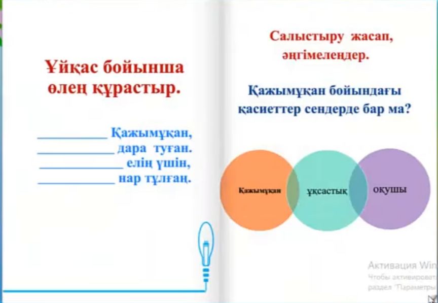 Ұйымдастыру кезеңі. ІІ. Психологиялық жағымды ахуал туғызу «Екеуміздің ұқсастығымыз сонда...» Бір оқушы сыртқы шеңбер, ал екінші оқушы ішкі шеңбер жасайды. Бір - біріне қарама - қарсы тұрады. Сыртқы шеңбердегі әр бала, өзінің ішкі шеңбердегі сыңарына: «Екеуміздің ұқсастығымыз...», деп айтқан кезде, ішкі шеңбердегі сыңары «Екеуміздің айырмашылығымыз...», деп жауап қайтарады. Үй тапсырмасын сұрау. «Ой қозғау».