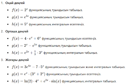 С –деңгейі Төмендегі күрделі функциялардың туындысын және интегралын табыңыздар: 1)