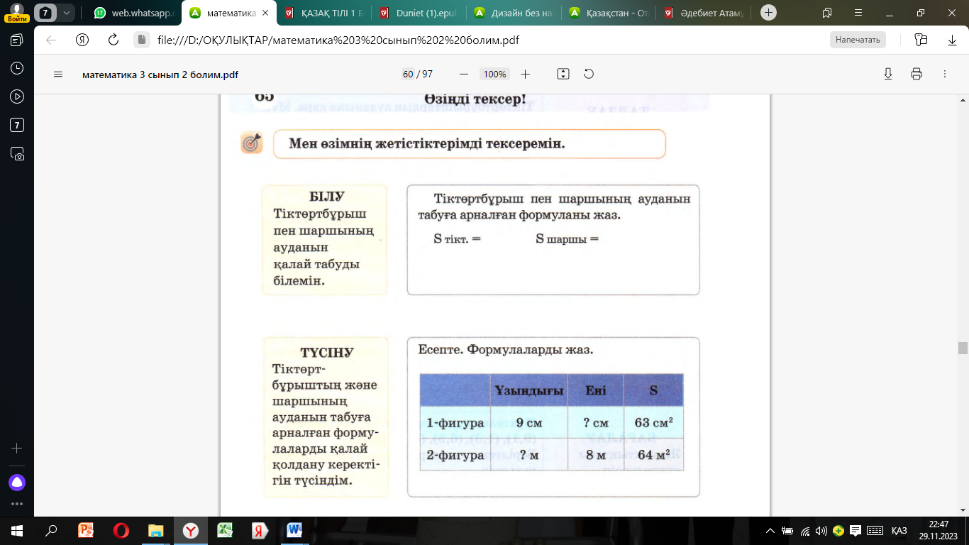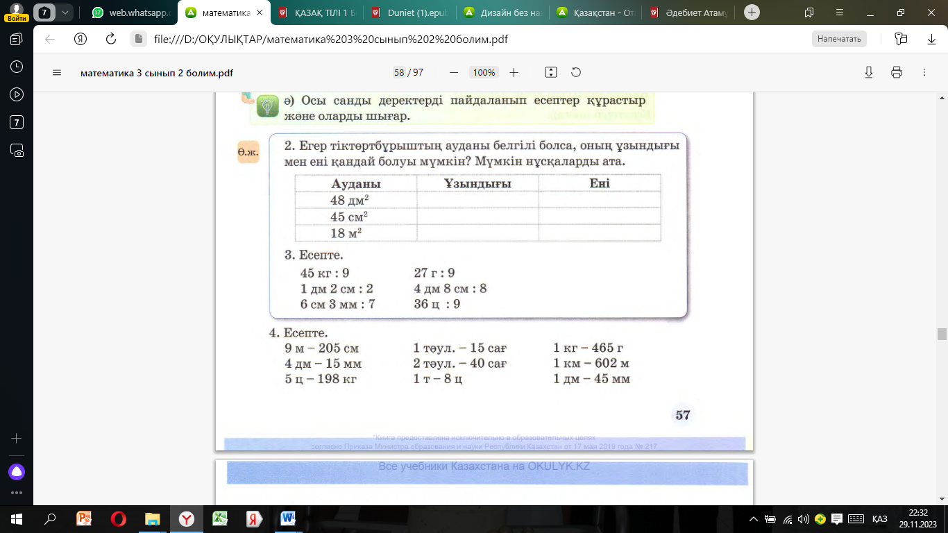3.5.1.4 шамалар арасындағы тәуелділікке; пропорцияның белгісіз мүшесін табуға берілген есептерді талдау және шығару 3.5.1.5** тіктөртбұрыштың (шаршының) қабырғалары мен ауданын табуға есептерді талдау және шығару |
