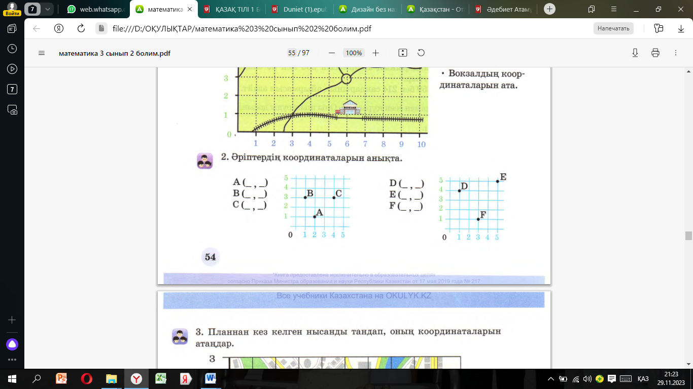 1. А,В,С әріптерінің координаталарын анықтайды 2.D,E,F әріптерінің координаталарын анықтайды 3.анықтау жолын түсіндіреді Сұрақтарға жауап береді |