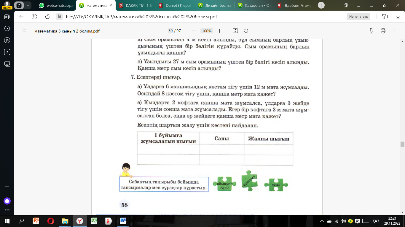 1-тапсырма Амалдардың орындалу ретін анықта.Баған түрінде жаз және есепте. Дескриптор: - бірінші өрнектегі амалдардың орындалу ретін анықтап,мәнін дұрыс есептейді (2 балл) - екінші өрнектегі амалдардың орындалу ретін анықтап,мәнін дұрыс есептейді (2 балл) - үшінші өрнектегі амалдардың орындалу ретін анықтап,мәнін дұрыс есептейді (2 балл) - төртінші өрнектегі амалдардың орындалу ретін анықтап,мәнін дұрыс есептейді (2 балл) 2 – тапсырма Есепті шығар. Дескриптор: - есептің қысқаша шартын дұрыс құрады -амал таңбасын дұрыс таңдап,мәнін дұрыс есептейді -жауабын толық жазады (барлығы 1балл) |