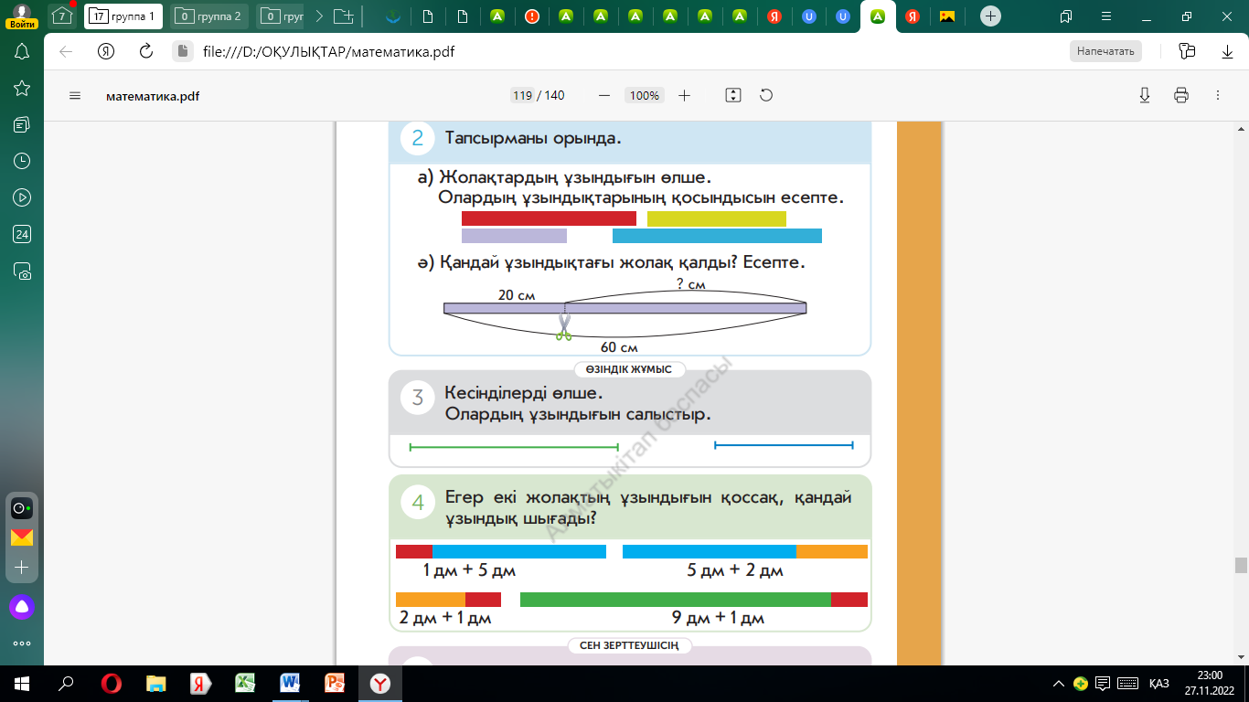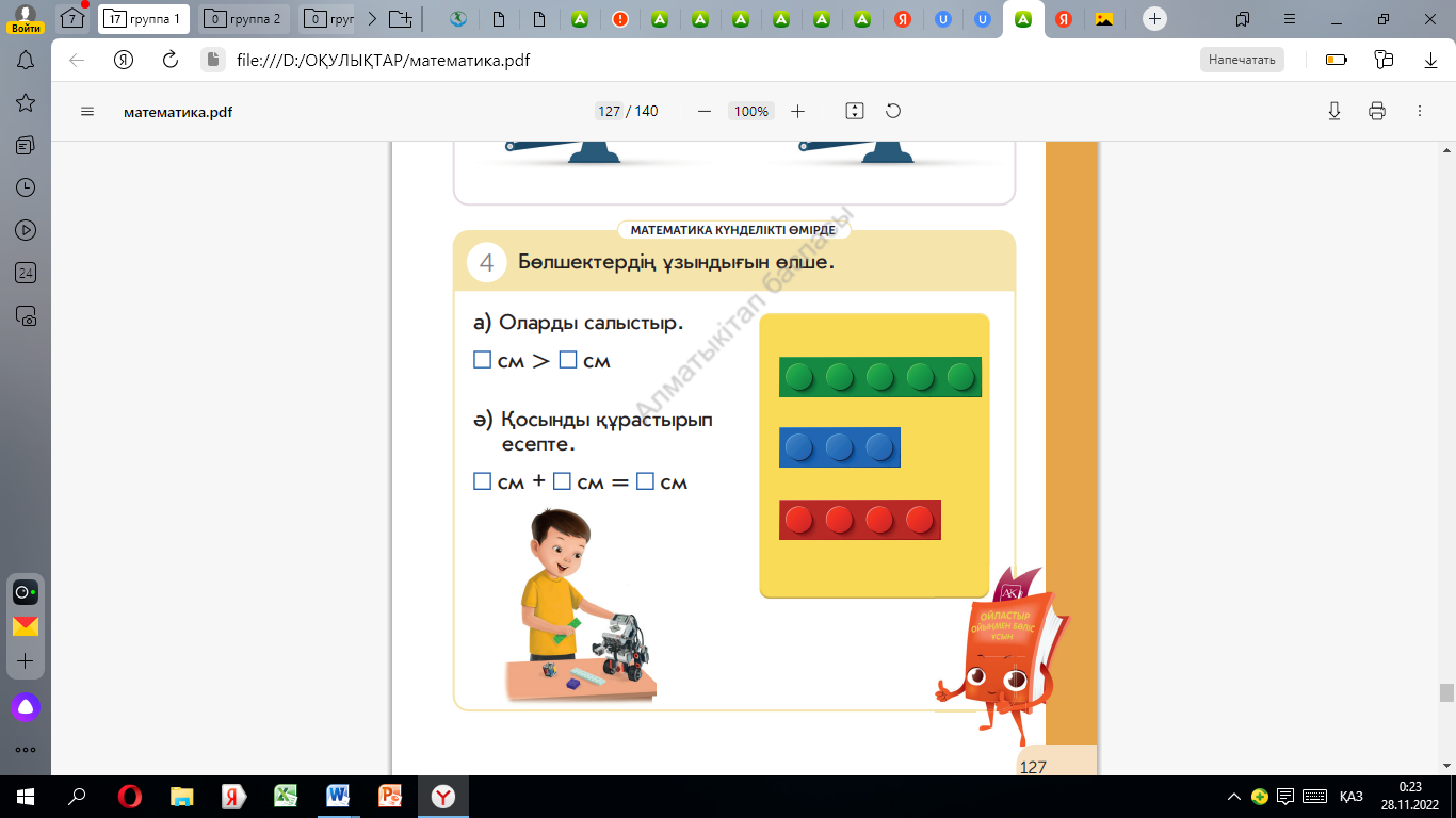 3 –тапсырма Жұптық жұмыс «Ойлан,жұптас, бөліс» әдісі Бөлшектердің ұзындығын өлше. Оларды салыстыр. Қосынды құрастырып есепте. Дескриптор: -бөлшектердің ұзындығын өлшейді -ұзындықтарын салыстырады -қосынды құрастырады - мысалдың мәнін есептейді |