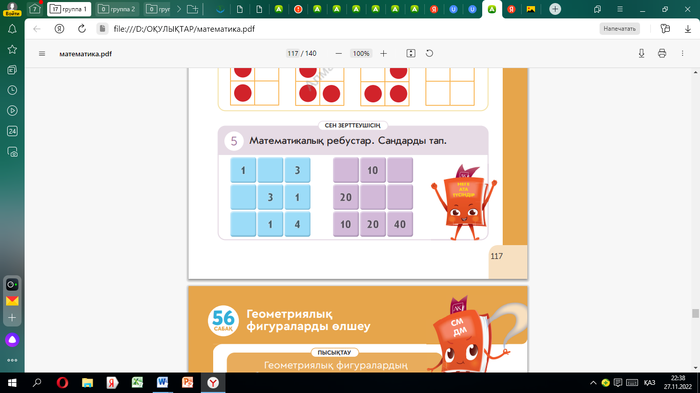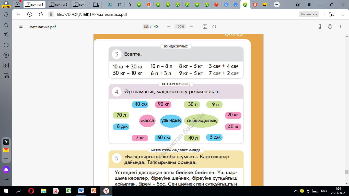 1.1.3.3** ұзындық (см, дм)/ масса (кг)/көлем (сыйымдылық) (л)/ уақыт (сағ) салыстыру және шамалар мәндерімен қосу мен азайту амалдар орындау; 1.4.2.2** бірдей цифрлар мен фигуралардан тұратын басқатырғыштар, есептер, ребустар шешу |