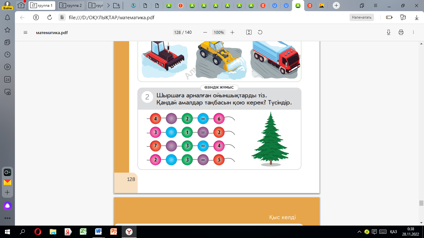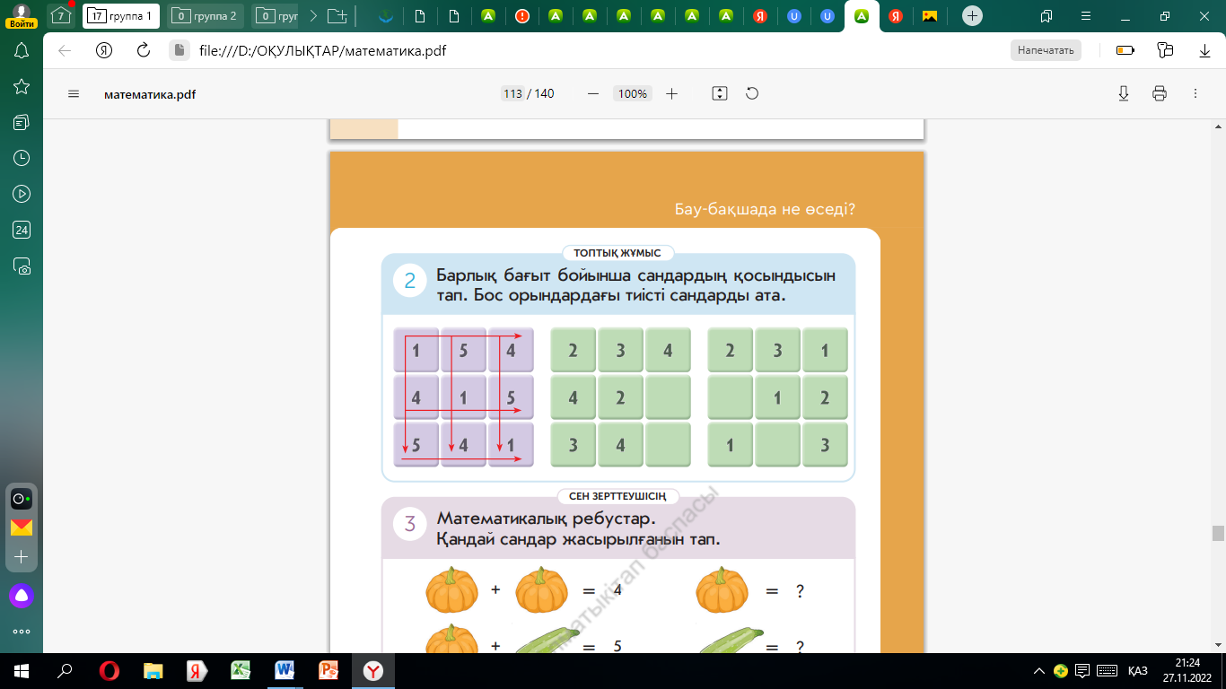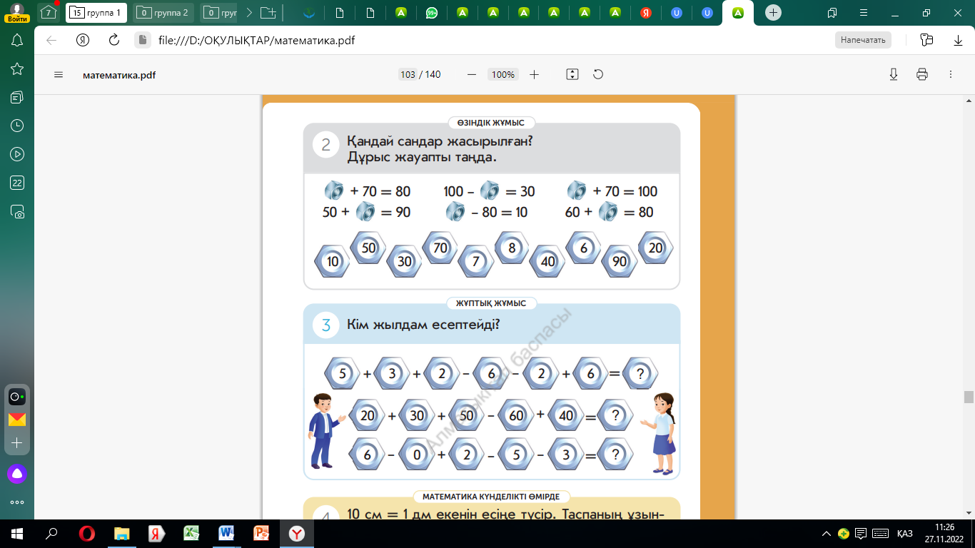 Ойыншылардың әрқайсысынеше ұпай жинағанын анықтап, мысал түрінде жазады 1. қосуға мысалдар құрастырып, жазады 2.мысалдың мәнін есептейді 3.азайтуға мысалдар құрастырып, жазады 4.мысалдың мәнін есептейді |