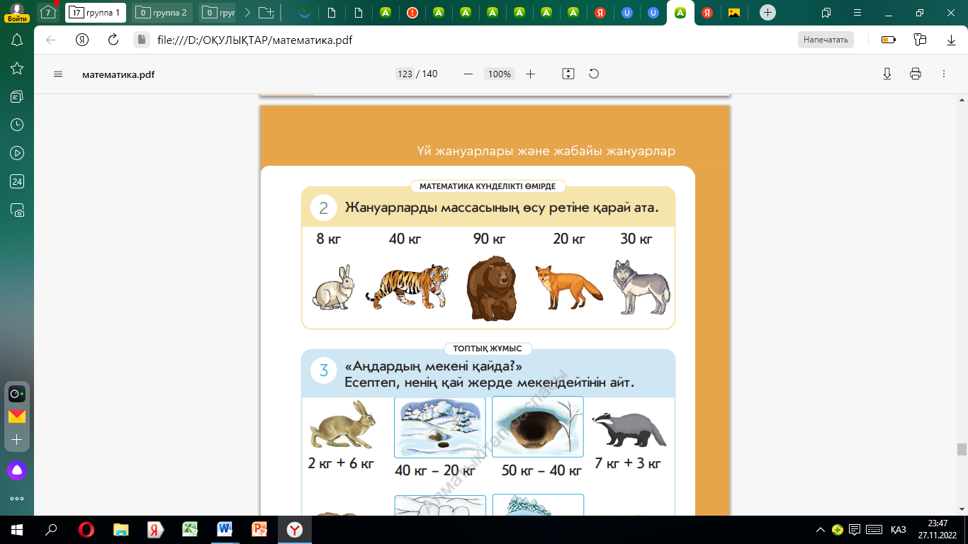 жануарлардың массасын өсу ретімен жазады мысалдарды есептеп, ненің қай жерде мекендейтінін айтады |