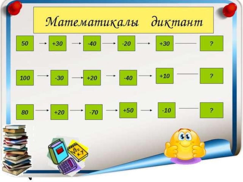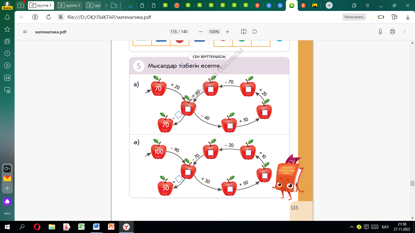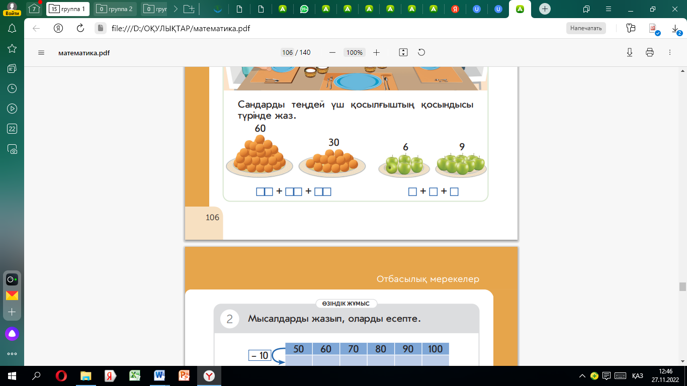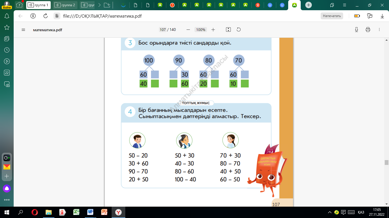 1.қосындының мәні 100 болатын мысалдың белгісіз қосылғышын жазады 2.қосындының мәні 90 болатын мысалдың белгісіз қосылғышын жазады 3.қосындының мәні 80 болатын мысалдың белгісіз қосылғышын жазады 4.қосындының мәні 70 болатын мысалдың белгісіз қосылғышын жазады 5.белгісіз санды анықтау жолын түсіндіреді