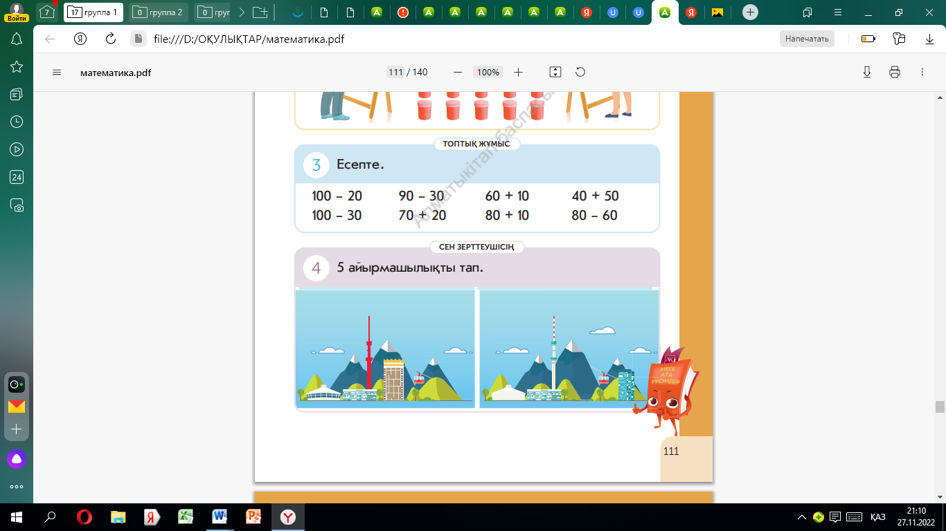 1. қосудың мәнін есептейді 2.азайтудың мәнін есептейді 3.үш қосылғышы бар мысалды есептейді 4.екі азайтқышы бар мысалды есептейді