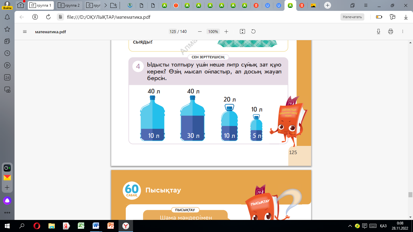 1. бірінші ыдысты толтыру үшін қанша сұйық зат қажеттігін анықтайды 2.екінші ыдысты толтыру үшін қанша сұйық зат қажеттігін анықтайды 3.үшінші ыдысты толтыру үшін қанша сұйық зат қажеттігін анықтайды 4.төртінші ыдысты толтыру үшін қанша сұйық зат қажеттігін анықтайды