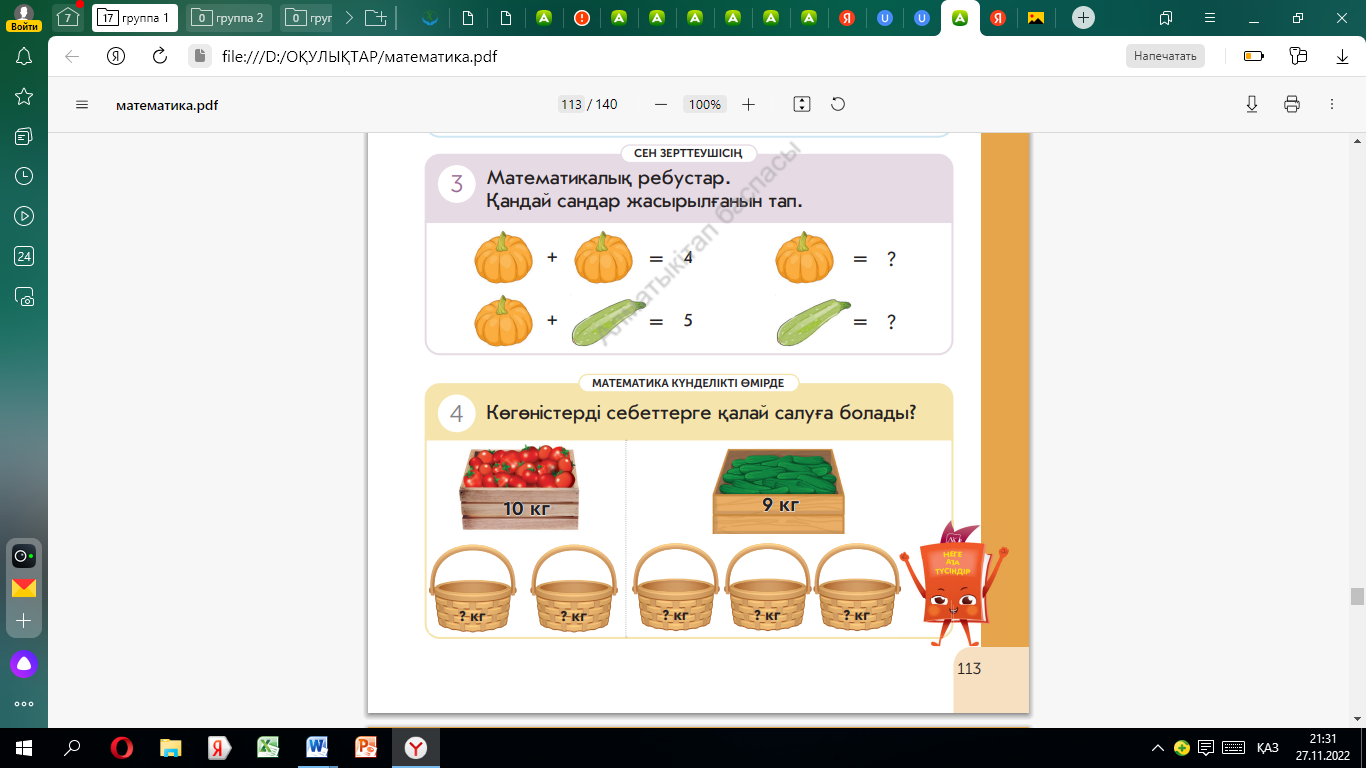 Бөлшектерді екі қорапқа бөлуді орындайды. Мысалдарды жазады. Түсіндіреді 1. жасырылған санды анықтайды 2.жасырылған санды жазады 3. санды табу жолын түсіндіреді |