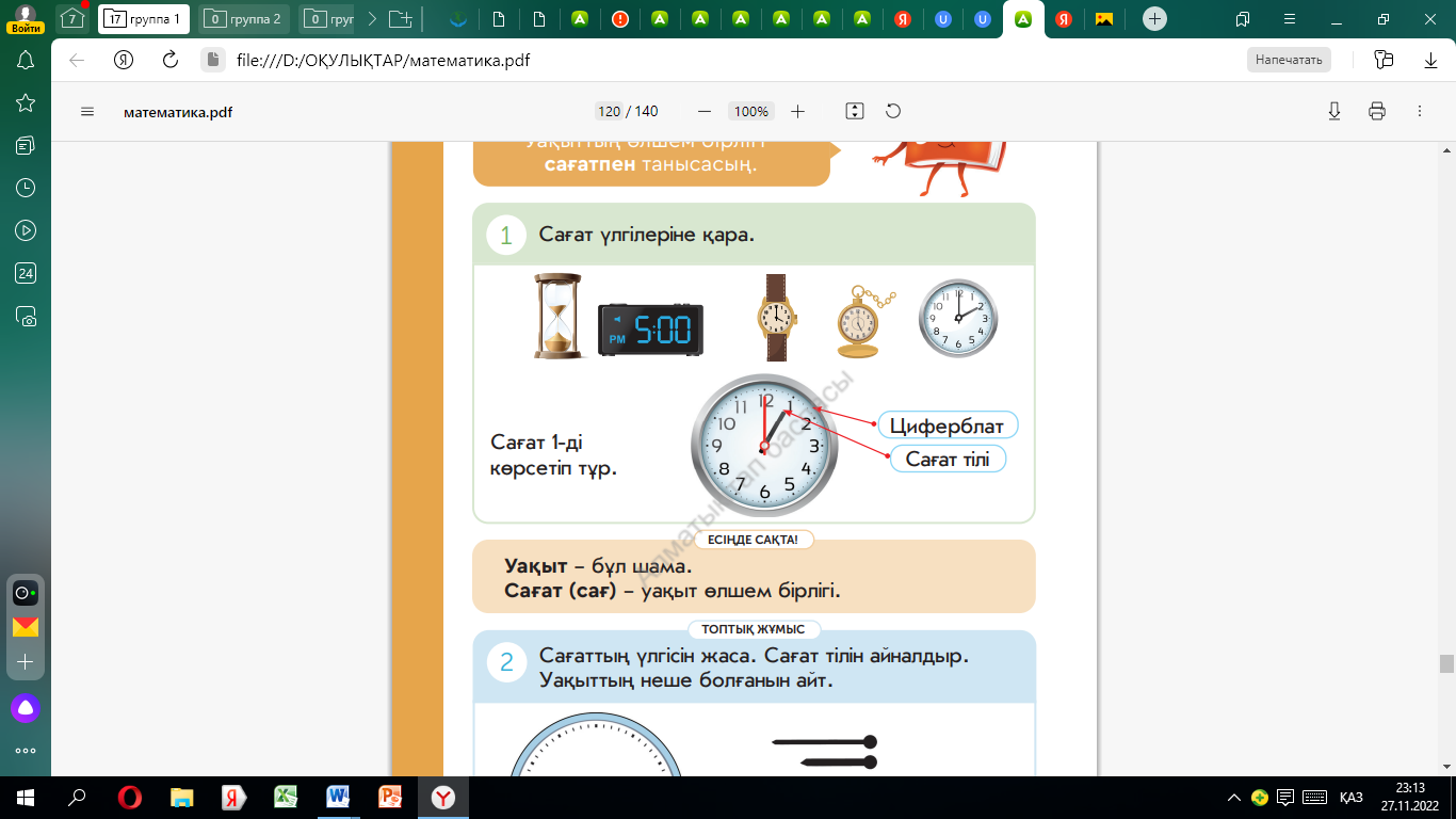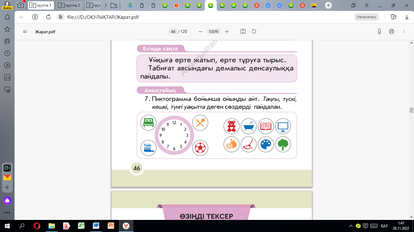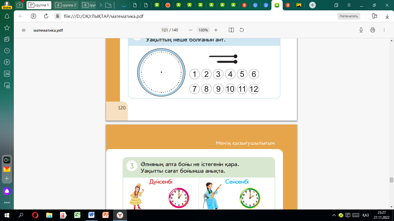 сағаттың үлгісін жасайды сағат тілін айналдырып, уақыттың неше болғанын айтады Әлияның апта бойы не істегенін түсіндіреді