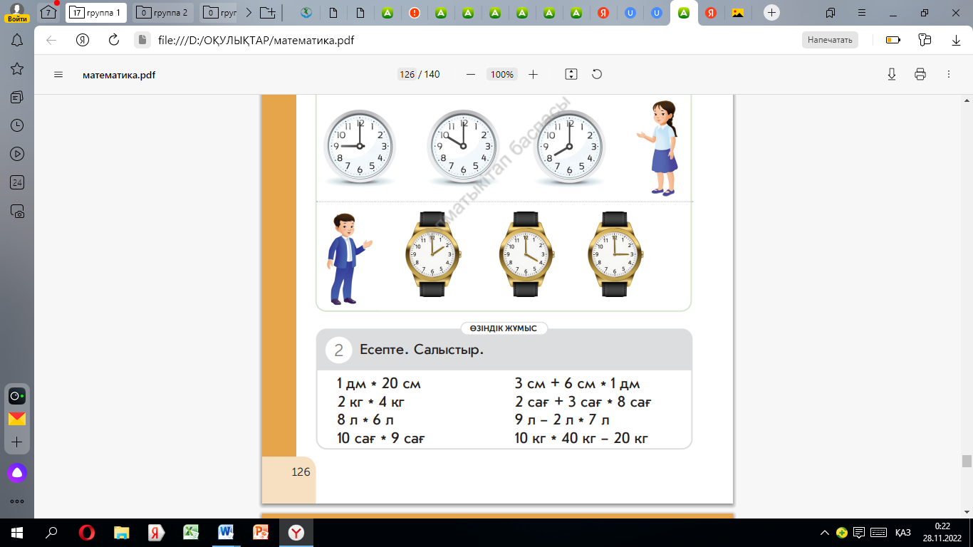1.1.3.3** уақыт (сағ) салыстыру және шамалар мәндерімен қосу мен азайту амалдар орындау; 1.1.3.4 ұзындық өлшем бірліктерін: см, дм олардың арақатысына сүйеніп түрлендіру |