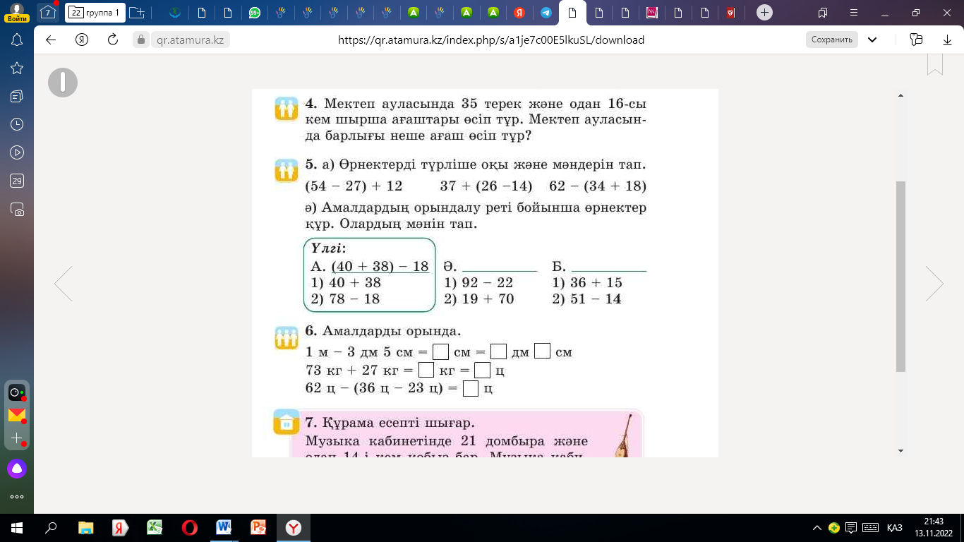 2 – тапсырма Ұжымдық жұмыс «Түрлендір» әдісі Көрсетілген өлшем бірліктеріне түрлендір. ЕББҚ Тапсырманы орындағанда қолдау көрсету Талқылау сұрақтары 1. Тапсырманы орындағанда не оңай ,не қиын болды? 3 – тапсырма Жеке жұмыс «Құрастыр» әдісі Амалдардың орындалу реті бойынша өрнектер құр. 1)(32 + 47) -48 =79 – 48 =31 2)(67 – 49 ) – 5 = 18 – 5 = 13 3) 97 - (66 + 29) = 97 – 95 = 2 ЕББҚ Тапсырманы орындағанда қолдау көрсету Талқылау сұрақтары 1. Тапсырманы орындағанда не оңай ,не қиын болды? «Шеңбер жасап жүреміз» Бейнекөрініс ұсынылады |