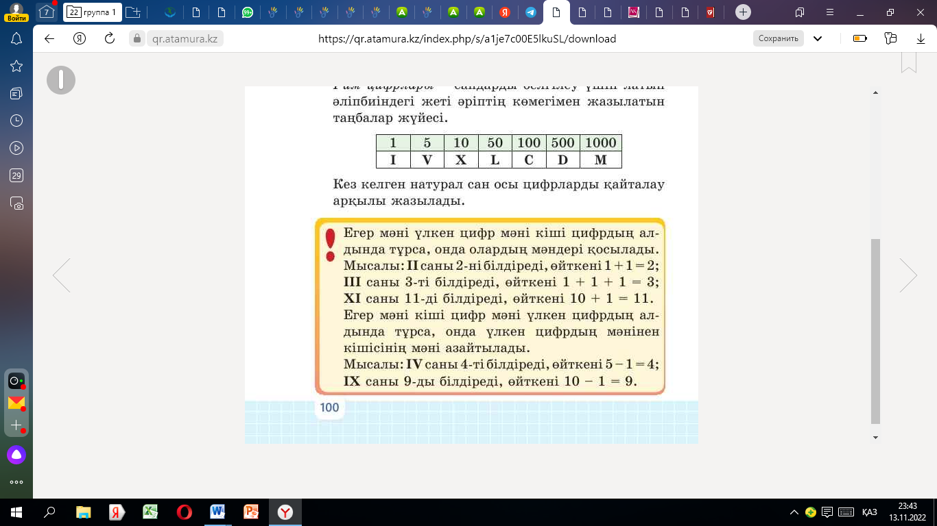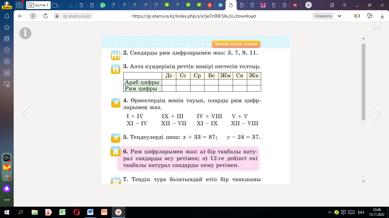 Берілген сандарды рим цифрларымен жазады апта күндерінің ретін рим цифрларымен жазады өрнектердің мәнін тауып, рим цифрымен жазады |