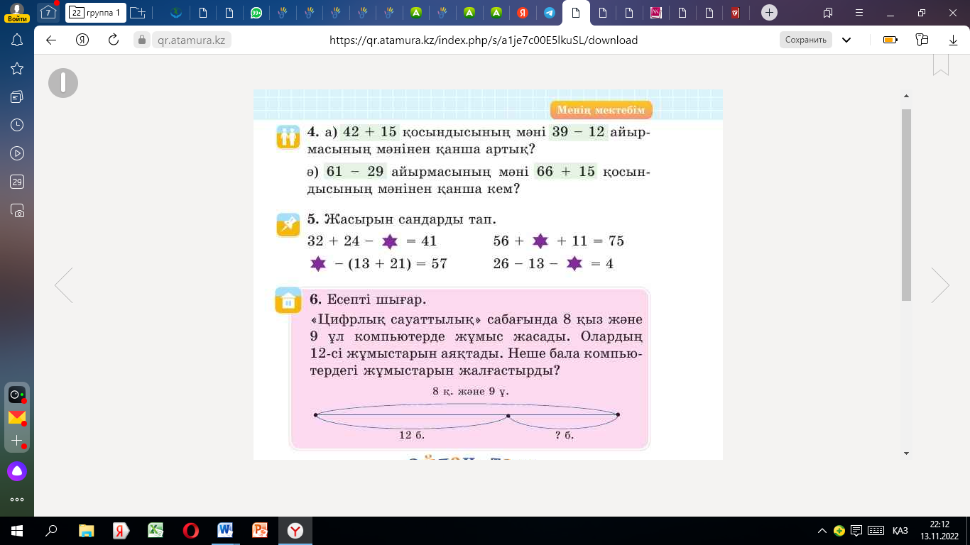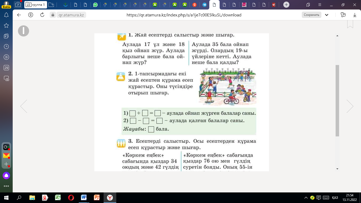 Е Жұлдыз – 12 ою ? ою ойды Мақпал -? , 5-уі артық Ш: 1) 12 + 5 = 17 2) 12 + 17 = 29 Ж: Қыздар барлығы 29 ою ойды ЕББҚ Тапсырманы орындағанда қолдау көрсету Талқылау сұрақтары 1. Тапсырманы орындағанда не оңай ,не қиын болды? |