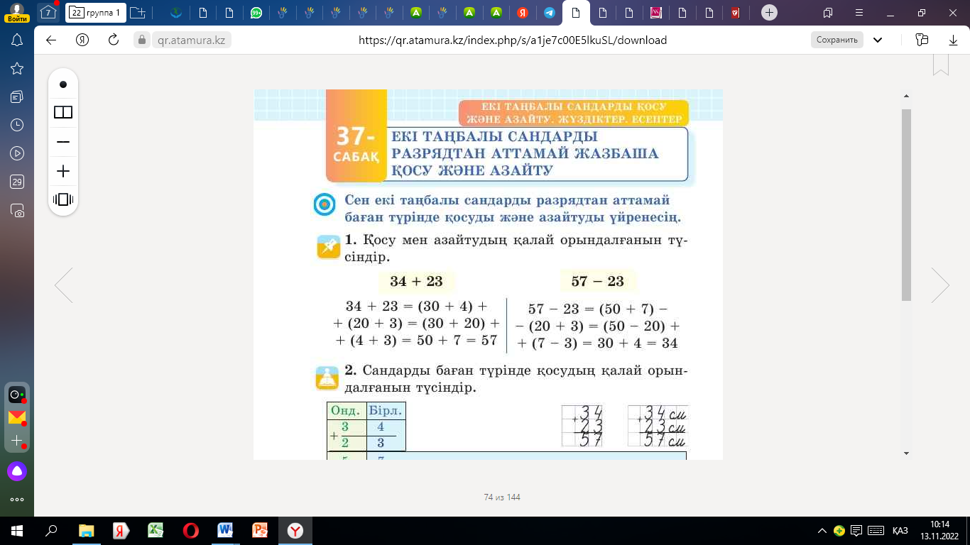 2.1.2.8. 34 + 23, 57 – 23, 45 ± 19, 47 + 33, 80 – 47, 100 - 35 жағдайларында екі таңбалы сандарды қосу және азайту алгоритмдерін қолдану. |