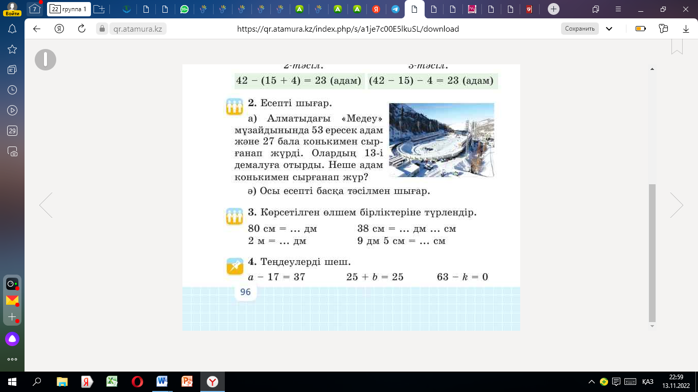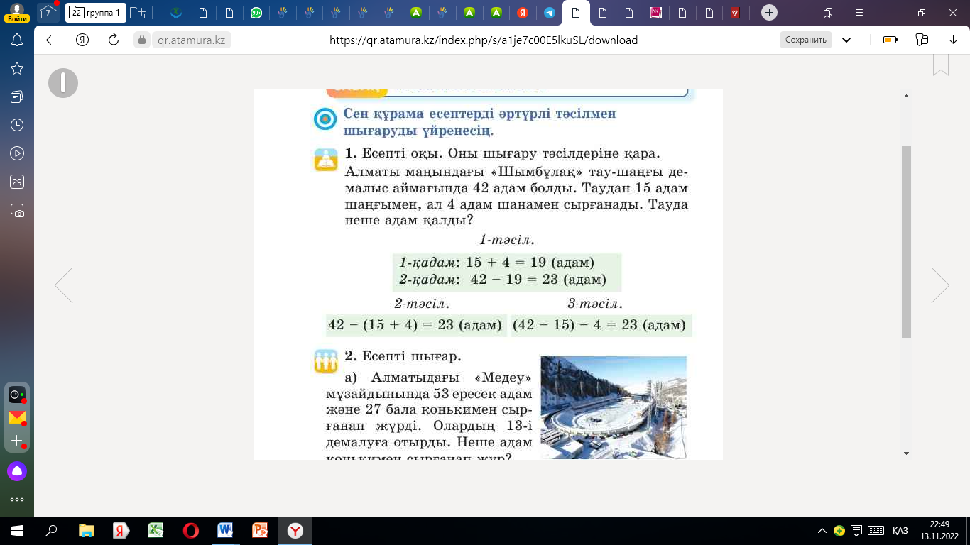 1-тапсырма Жұптық жұмыс «Ойлан, жұптас, бөліс» әдісі Есепті шығар. Ересек-53 Бала – 27 Отырды – 13 Қалғаны - ? Ш: 1) 53 + 27 = 80 2) 80 – 13 = 67 Ж: 67 адам конькимен сырғанап жүр. 3) (53 – 13) +27 = 67 ЕББҚ Тапсырманы орындағанда қолдау көрсету Талқылау сұрақтары 1. Тапсырманы орындағанда не оңай ,не қиын болды? |