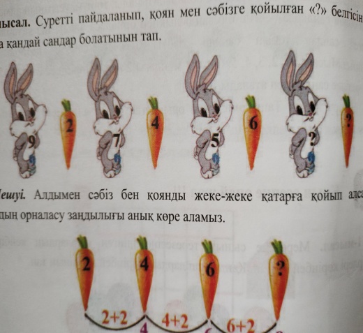 1. есептің шартын жазады 2.шешу амалтаңбасын таңдап, өрнек құрастырады 3.мәнін есептеп, жауабын жазады Сұраққа жауап береді Балалар жаттығу жасайды |