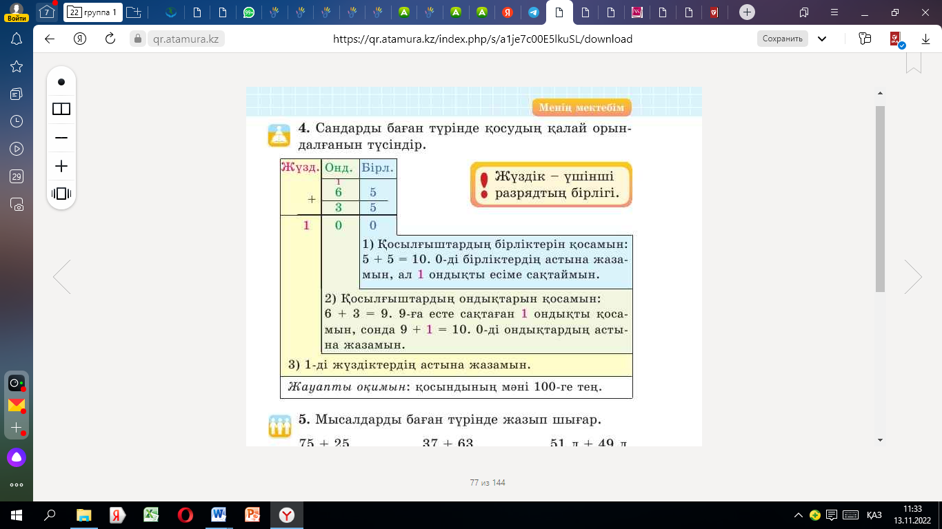 1. мысалдарды баған түрінде жазады 2.қосудың мәнін есептейді