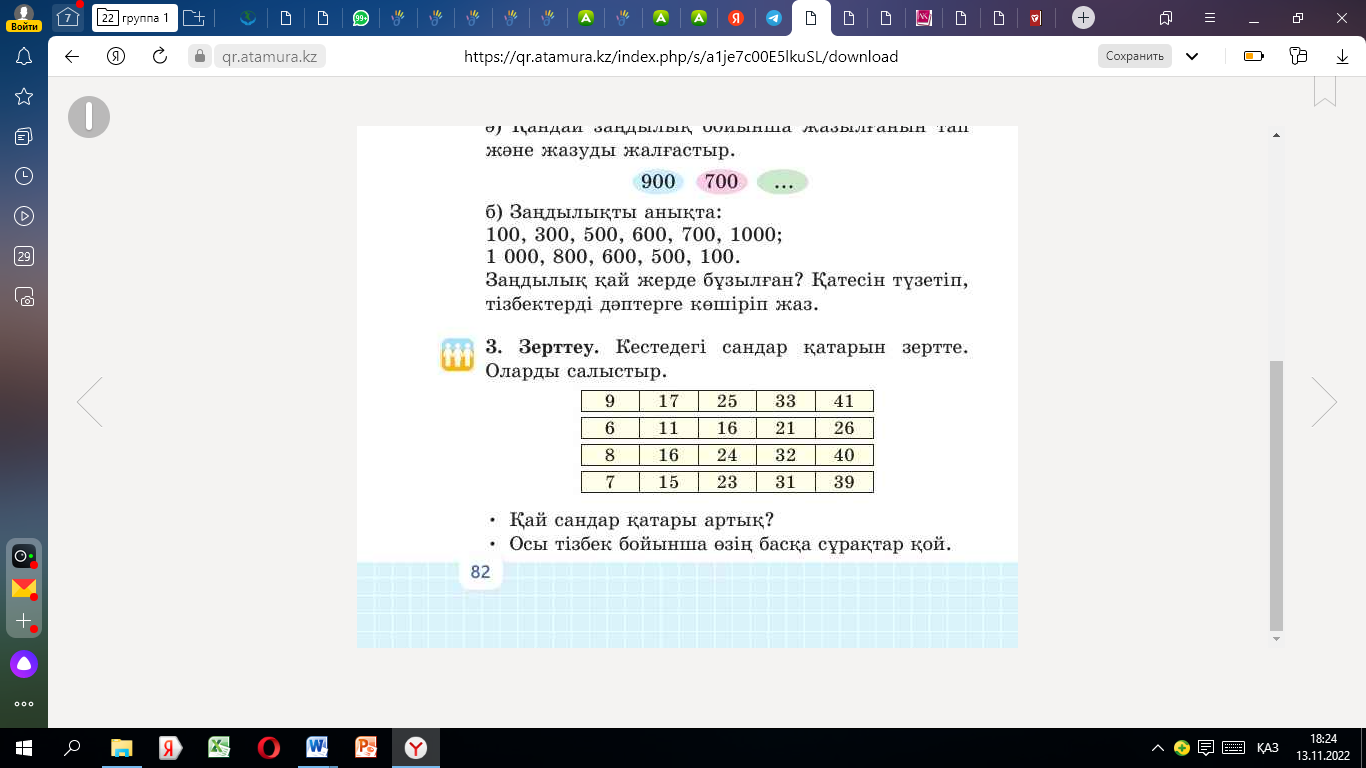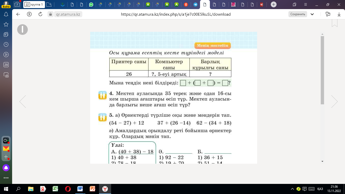«Комментарий» арқылы Дескриптор: -есептің шартын жазады(1б) -шешу амалтаңбасын таңдап,өрнек құрады(1б) -мәнін есептеп, жауабын жазады(1б) Дескриптор: -тапсырманы орындайды «Комментарий» арқылы Дескриптор: -мысалдарды баған түрінде жазады(1б) -мысалдардың мәнін есептейді(1б) |