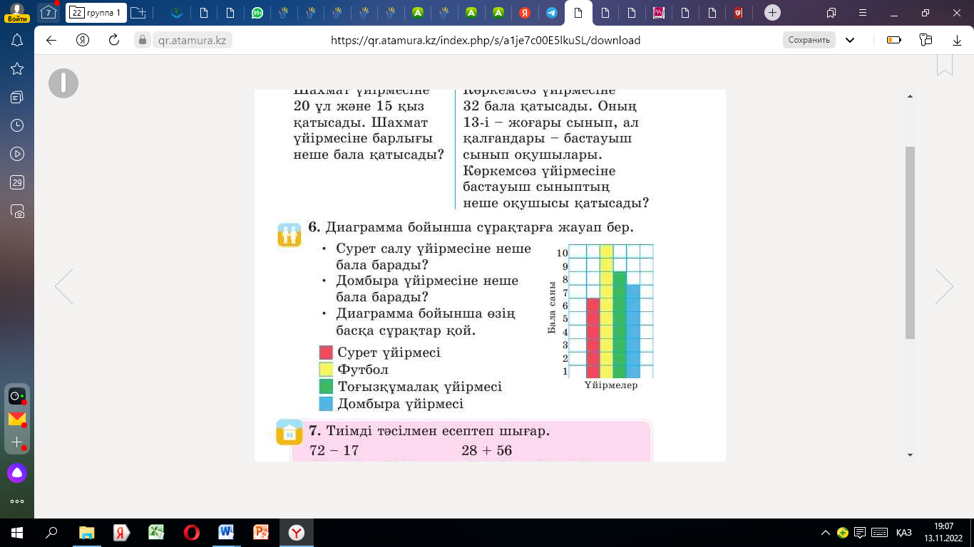 2 – тапсырма Ұжымдық жұмыс «Есепте» әдісі Есепті шығар. Барлығы -16 б. Қобыз – 2 Сырнай – 4 Домбыра - ? Ш: 1) 2 + 4 = 6 2) 16 – 6 = 10 Ж: Домбыраны 10 бала үйреніп жүр. ЕББҚ Тапсырманы орындағанда қолдау көрсету Талқылау сұрақтары 1. Тапсырманы орындағанда не оңай ,не қиын болды? «Шеңбер жасап жүреміз» Бейнекөрініс ұсынылады |