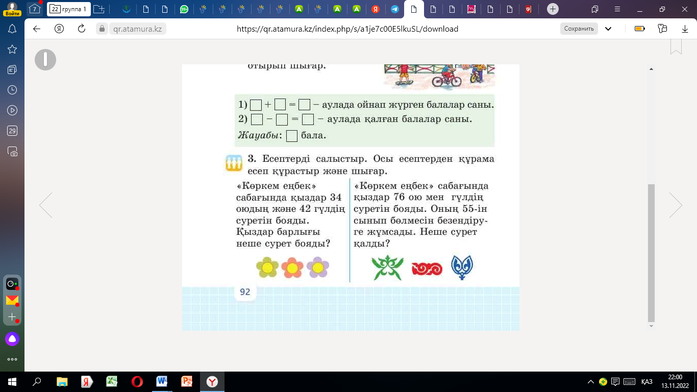 1-тапсырма Жұптық жұмыс «Ойлан, жұптас, бөліс» әдісі Есептерді салыстыр. Есептерден құрама есеп құрастыр. Есепті шығар. Ою - 34 Гүл – 42 Безендіруге -55 Қалды - ? Ш: 1) 34 + 42 = 76 2) 76 - 55 = 21 Ж: 21 сурет қалды ЕББҚ Тапсырманы орындағанда қолдау көрсету Талқылау сұрақтары 1. Тапсырманы орындағанда не оңай ,не қиын болды? |