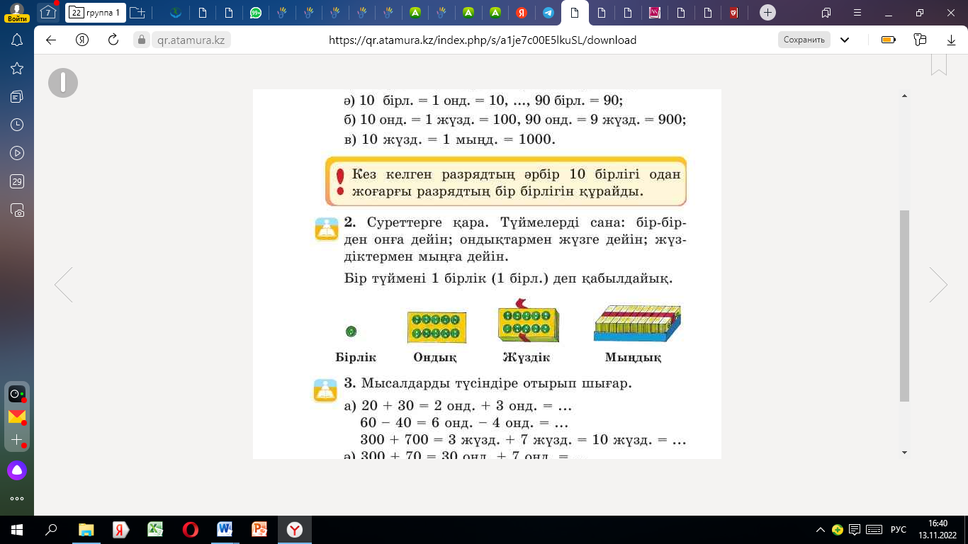 2.1.1.4. Санаудың ірі бірлігі жүздікті құрастыру, 1000-ға дейін жүздіктермен санау, жазу, салыстыру. 2.1.2.5 біртаңбалы сандарды ондықтан аттап қосу және азайту/300+200 (3жүзд.+2жүзд.), 170-130 (17онд.-13онд.) түрінде ауызша қосу және азайтуды орындау. |