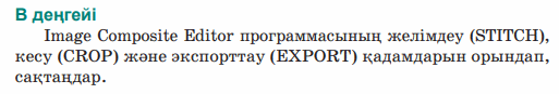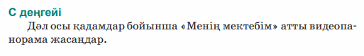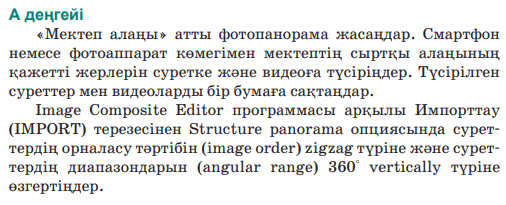 Дескриптор - «Мектеп алаңы» аты фотопанорма жасайды 2 балл Дескриптор: Image Composite Editor-программасының желімдеу , кесу және экспорттау қадамдарын орындап сақтайды 2 балл Дескриптор: Берілген тапсырма бойынша сөйлемді аяқтайды Дескриптор: -«Менің мектебім» атты видеопанорма жасайды 4 балл |