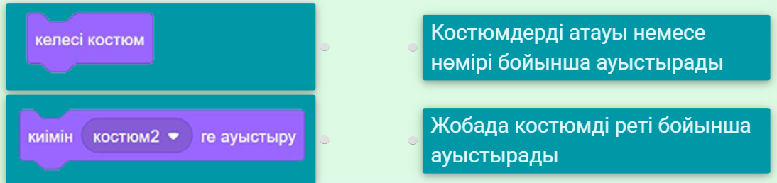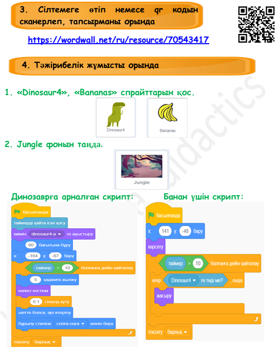 3.4.1.1 Scratch (скретч) программалау ортасында берілген сценарий бойынша алгоритм циклін әзірлеу; 3.4.2.3 Scratch (скретч) программалау ортасында бірнеше кейіпкерлер құру; 3.4.2.2 Scratch (скретч) программалау ортасында сахна үшін бірнеше фон құру; 3.4.2.4 Scratch (скретч) программалау ортасында ойындарды құру кезінде қайталау алгоритмін іске асыру |