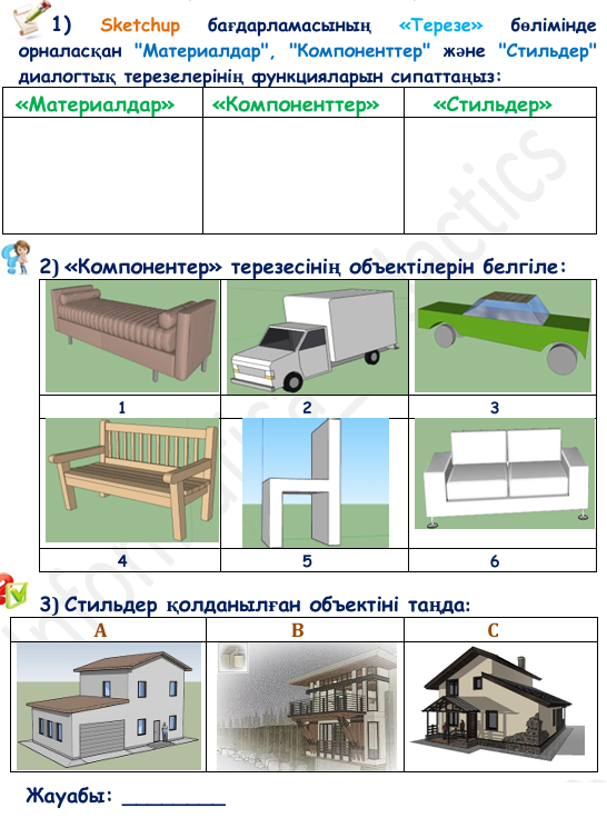 Білімді бекіту 1-тапсырма. SketchUp бағдарламасының «Терезе» бөлімінде орналасқан «Материалдар», «Компоненттер» және «Стильдер» диалогтық терезелерінің функйияларын сипаттаңыз: