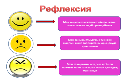 Сабақ бойынша рефлексия Сабақ мақсаттары/оқу мақсаттары дұрыс қойылған ба? Оқушылардың барлығы ОМ қол жеткізді ме? Жеткізбесе, неліктен? Сабақта саралау дұрыс жүргізілді ме? Сабақтың уақыттық кезеңдері сақталды ма? Сабақ жоспарынан қандай ауытқулар болды, неліктен? |