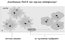 Миға шабуыл. әдісі арқылы проблемалық сұрақ қойып, сурет көрсетіп, жетелеу сұрақтары арқылы сабақтың мақсаты мен тақырыбын ашады. Суретте кәдімгі амебаның ас тұзына тітіркену реакциясы көрсетілген.