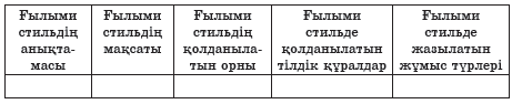 Ғылыми стиль туралы теориялық ақпарат алады. Теориялық мәтін бойынша төмендегі кестені толтырады.
