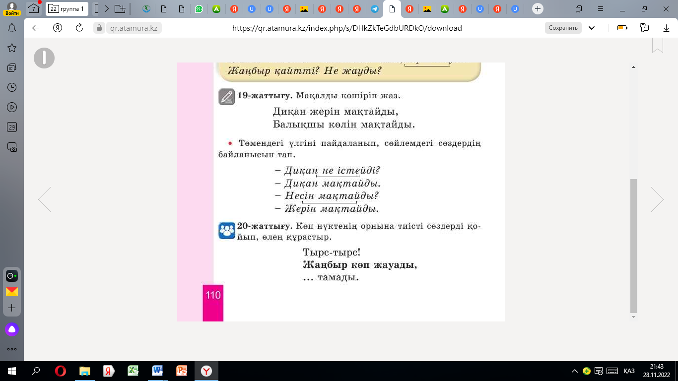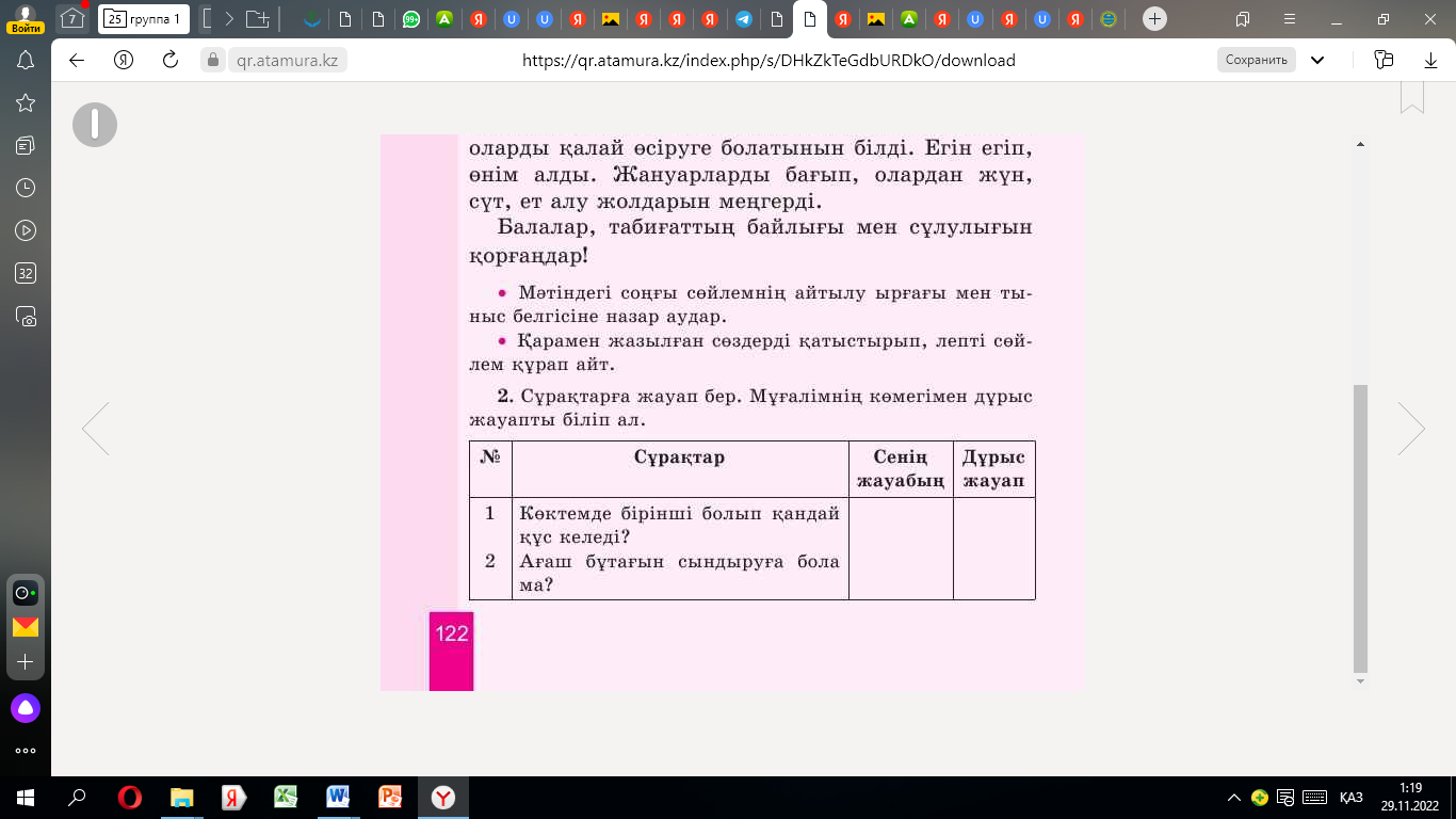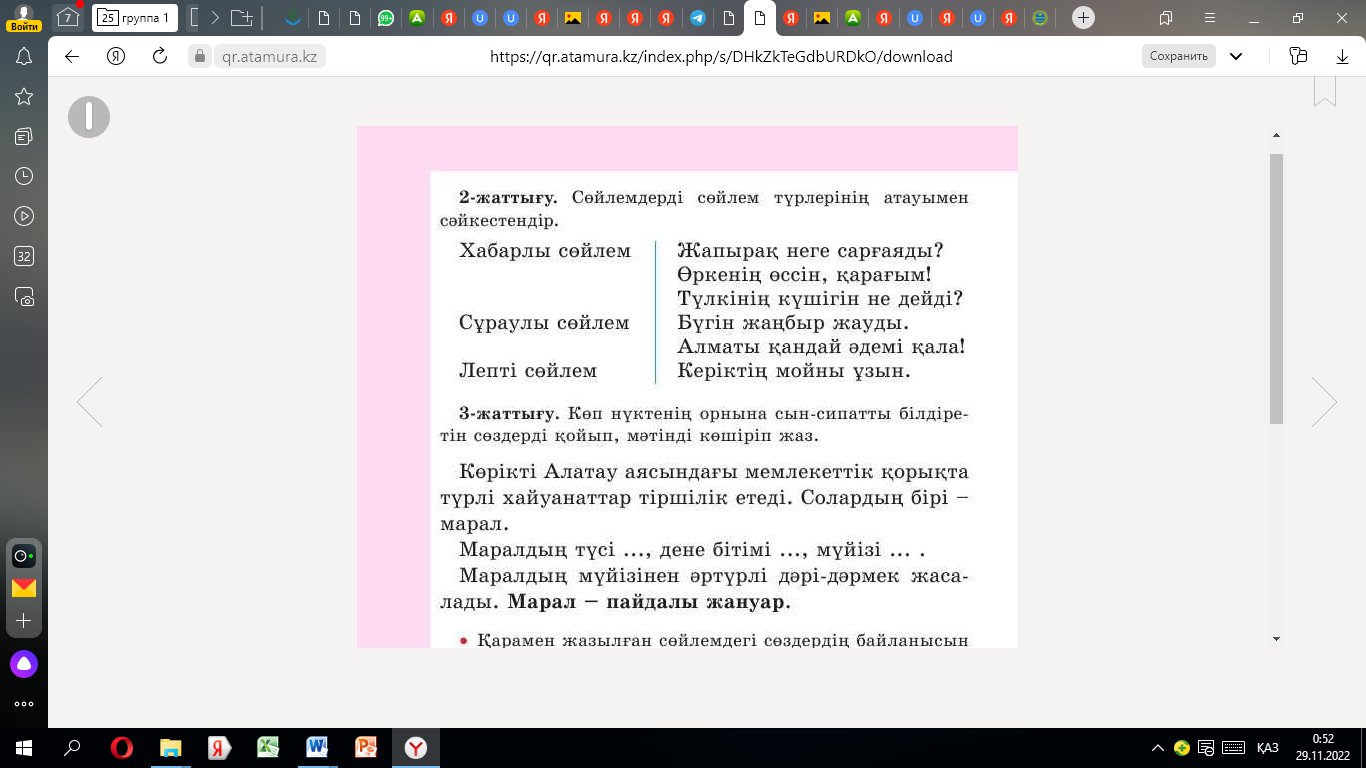 1. мәтіннің мазмұнын айтады 2.сөйлемнің айтылу ырғағы мен тыныс белгісі туралы айтады 3.берілген сөздерді қатыстырып, сөйлем құрайды 4.сөйлемдегі сөздердің байланысын сызбамен көрсетеді