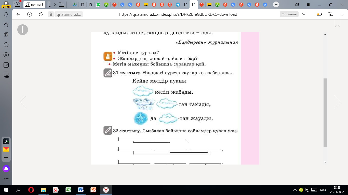 1. өлеңнің мазмұнын айтады 2.қарамен жазылғандарды сөйлемнің түріне ажыратады 3.жаңбырдың неге жауатынын жазады 4.күн туралы мәлімет жазады 5.аспан туралы мәлімет жазады 6.биік таулардың атын жазады