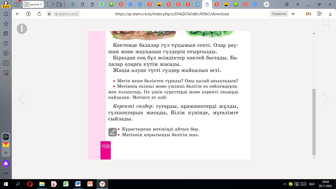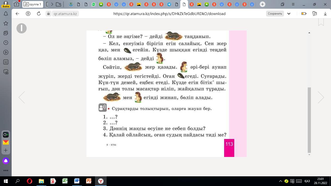 1. мәтіннің мазмұнын айтады 2.мәтінге ат қояды 3.мәтін кейіпкерлерінің тіршілік ортасын анықтайды 4.мәтіннен сұраулы, лепті сөйлемдерді теріп жазады