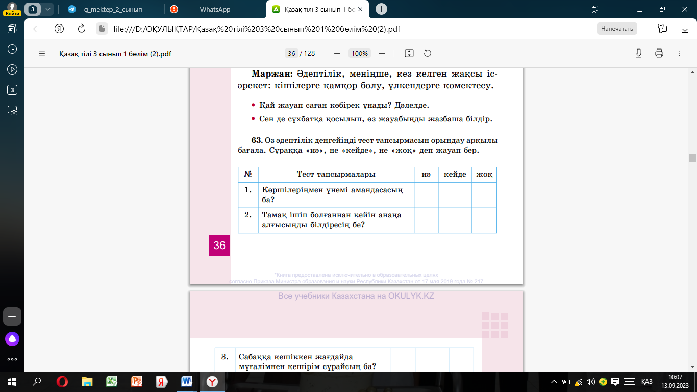 Үй тапсырмасын тексеру Таратпа 63-жаттығу 36,37-бет Өз әдептілік деңгейіңді тест тапсырмасын орындау арқылы бағала.